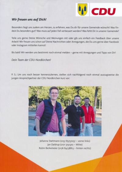 Am 13. September 2020 darfst Du das erste Mal bei der Kommunalwahl wählen. Du kannst mitentscheiden, wer Dich im Rat der Gemeinde Nordkirchen vertritt. Dabei zählt jede Stimme, denn oft ist die Wahlentscheidung knapp. Wir, die Kandidaten der CDUNordkirchen, wollen die Zukunft unserer Gemeinde gemeinsam mit Dir gestalten. Deshalb zählt für uns Deine Stimme!