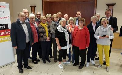 Alte und neue Vorsitzende der Senioren Union der CDU des Kreises Coesfeld bleibt Hildegard Kuhlmann aus Ascheberg, die anlässlich des Kreisseniorentages am 8. Oktober 2019 mit großer Mehrheit gewählt wurde und in ihre dritte Amtszeit geht. In der mit über 60 Teilnehmern gut besuchten Mitgliederversammlung im Landhotel Sendes in Bösensell begrüßte die Vorsitzende als Gast Landrat Dr. Christian Schulze Pellengahr, der gerne die Gelegenheit nutzte, den Senioren in der CDU einen „aktuellen Lagebericht“ der Entwicklungen im Kreis Coesfeld zu geben. Dabei stützte er sich u. a. auf einige bemerkenswerte Fakten, die auch Grundlage der jüngsten Preisverleihung „Landschaft 2019“ durch die Deutsche Stiftung Kulturlandschaft an den Kreis Coesfeld als ersten Kreis im Land Nordrhein-Westfalen waren. Dazu zählen insbesondere die gute Wirtschaftslage, ein hohes Durchschnittseinkommen der privaten Haushalte, eine geringe öffentliche Verschuldung und damit finanzielle Spielräume für zukunftsträchtige Entwicklungen. Hier wird es einen besonderen Schwerpunkt im Bereich der Mobilität geben, die insbesondere für den ländlichen Raum von entscheidender Bedeutung ist. Was die künftigen Aktivitäten der Senioren Union betrifft, wird die Vorsitzende Hildegard Kuhlmann von einem schlagkräftigen Vorstandsteam unterstützt, dass sich wie folgt zusammen setzt: Annegret Palz (Rosendahl) und Volker Barth (Olfen) als stellv. Vorsitzende, Maria Busemann-Holters (Coesfeld) als Schriftführerin sowie die Beisitzer/innen Siegfried Albrink (Dülmen), Richard Bolwerk (Coesfeld), Hildegard Bone (Lüdinghausen), Edith Eckert-Richen (Coesfeld), Dorothea Garthaus (Coesfeld), Magda Hackbart (Senden), Angelika Högemann (Ascheberg), Dieter Klaas (Dülmen), Georg Meyering (Rosendahl), Ulrich Röttger (Senden), Carla Roß (Nordkirchen) Bruno Schmied (Dülmen), Elisabeth Stüper (Havixbeck), Maria Weiling (Lüdinghausen) und Günter Wierling (Senden). Mit freundlichen Grüßen team CDU Kreisgeschäftsstelle CDU Kreisverband Coesfeld Zapfeweg 18 48653 Coesfeld Telefon 02541 9377 174 Telefax 02541 9377 176 E-Mail: post@cdu-coe.de Homepage: www.cdu-coe.de Text team CDU Kreisgeschäftsstelle, Foto CDU-Nordkirchen