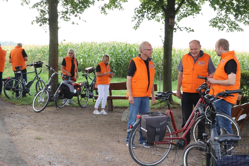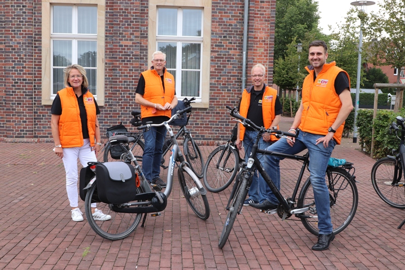 So richtig Glück hatte die CDU Nordkirchen am Freitag (04.05.) auf ihrer Sommerbereisung durch die drei Ortsteile mit dem sonnigen Wetter. Zunächst wurden die Verkehrssituationen am Buswendeplatz der Grundschule und der Schlossstraße bei der Baustelle Westermann vor Ort besichtigt. Weiter ging es zum Schuh und Sporthaus Bomholt, welches dass neue CDU Outfit gesponsert hatte. Zügig fuhren die Radfahrer weiter zum ehemaligen stellvertretenden Bürgermeister Clemens Quante nach Capelle, um sich gemeinsam das Dorfgemeinschaftshaus anzusehen. Danach ging es nach Südkirchen, wo nach einer Begehung des neuen Baugebiets ‚Auf dem Hegekamp‘ im Garten vom CDU Social Media Beauftragten Robin Berkemeier eine Erfrischungspause eingelegt wurde. Am Schloss vorbei ging es nach Nordkirchen zurück, wo der Abend gemütlich ausklang.