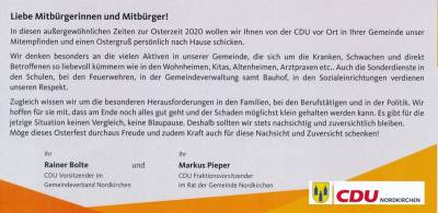 In diesen außergewöhnlichen Zeiten zur Osterzeit 2020 wollen wir Ihnen von der CDU vor Ort in Ihrer Gemeinde unser Mitempfinden und einen Ostergruß persönlich nach Hause schicken.